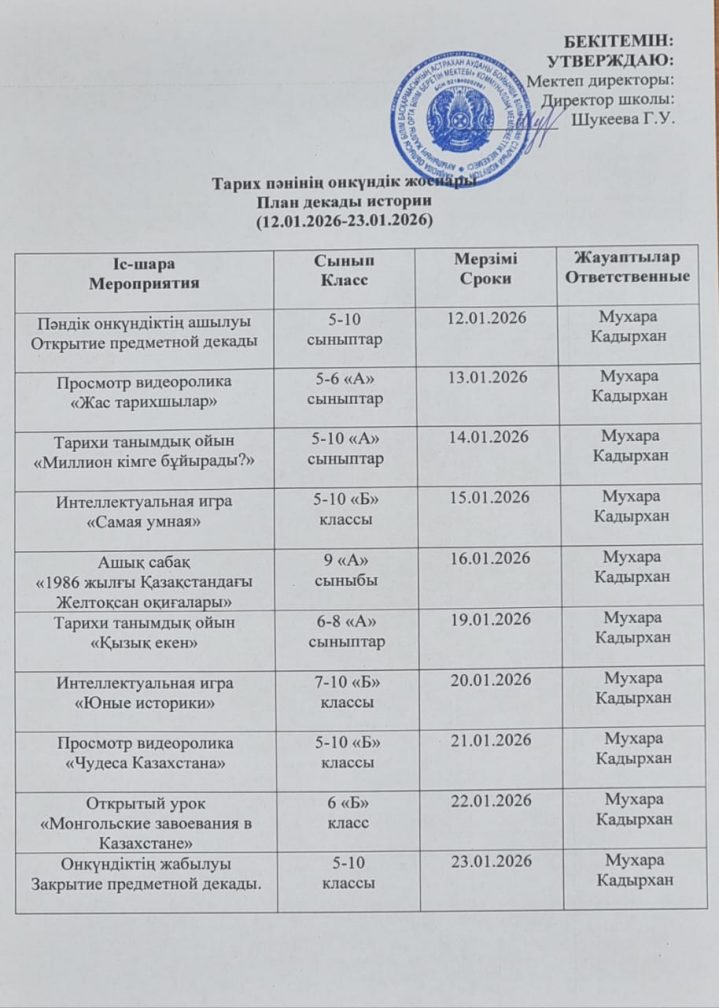 “Старый Колутон ауылының ЖОББМ”КММ 12.01-23.01.2026 ж аралығында тарих пәнінің онкүндік жұмыс жоспары құрылды.