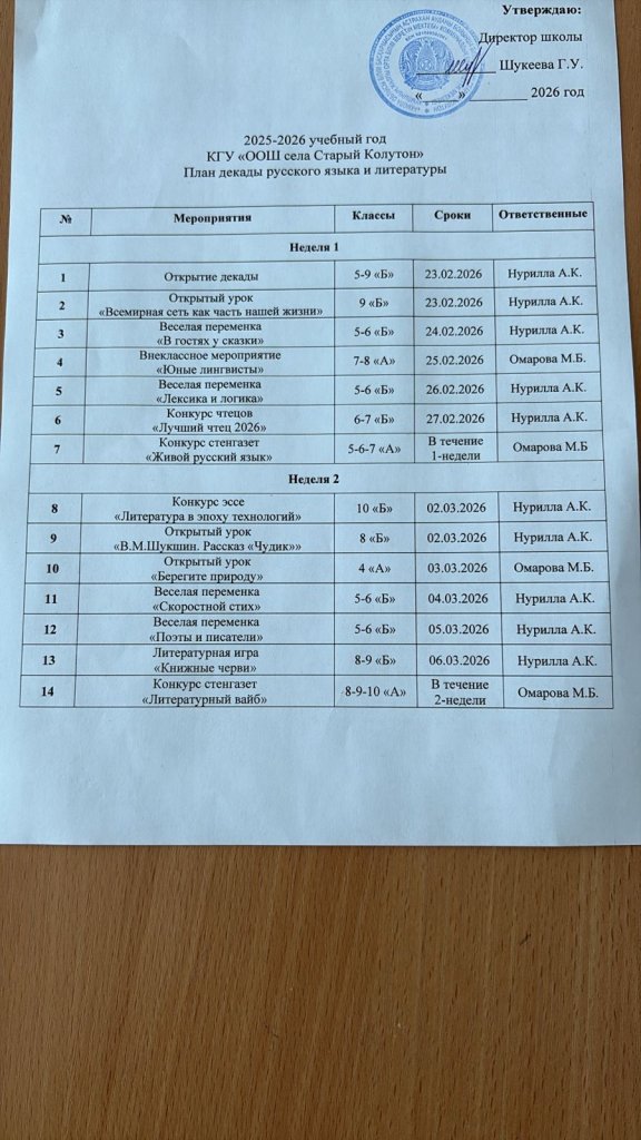 “Старый Колутон ауылының ЖОББМ” КММ 23 ақпаннан 06 наурызға дейін орыс тілі мен әдебиеті декадасының жұмыс жоспары құрылды.